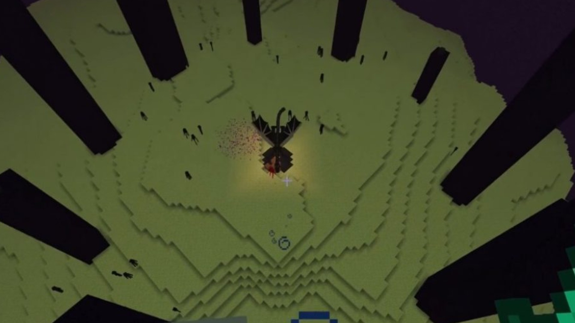The End is the final dimension in the game. This is because it contains the final boss named the Ender Dragon. To kill it, you first have to break the end crystals atop the obsidian pillars. Then you attack it by bow but when its perched, attack it with a sword. There are also lots Enderman so make sure you don't look at them.